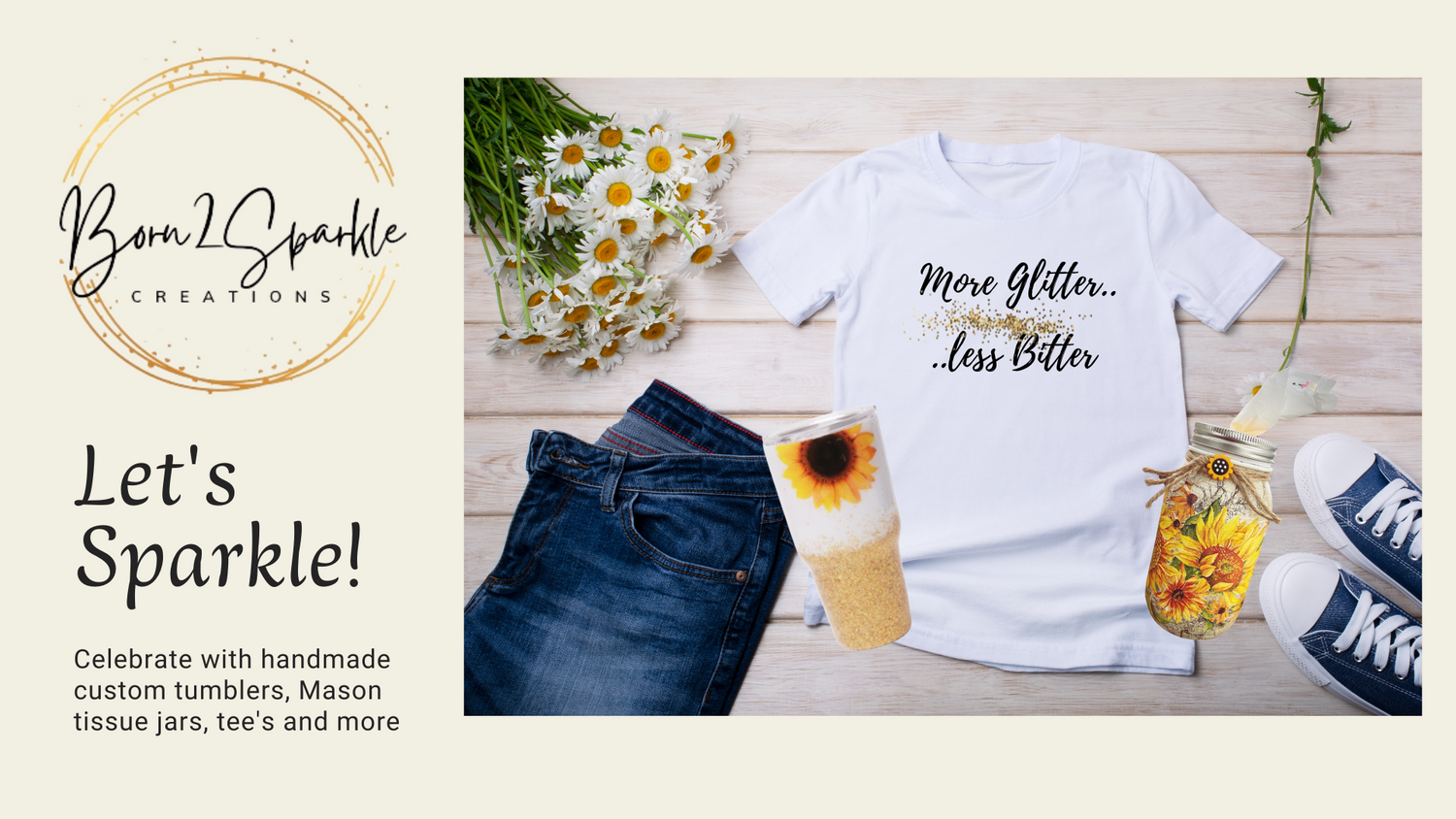We believe that everyone has a little sparkle in them, we want to bring it out. Born2Sparkle focuses on creating unique gifts, such as our Mason inspired tissue holders, Freshies, T-shirts and drinkware. There's much to see here. So, take your time, look around, and learn all there is to know about these amazing products.Â