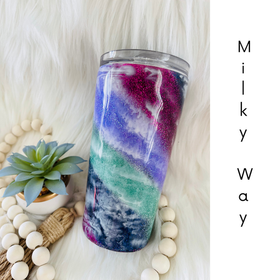 A Milky Way is a technic that creates a cloud effect over your glittered tumbler. This particular tumbler has 4 different glitters plus the Milky Way.
