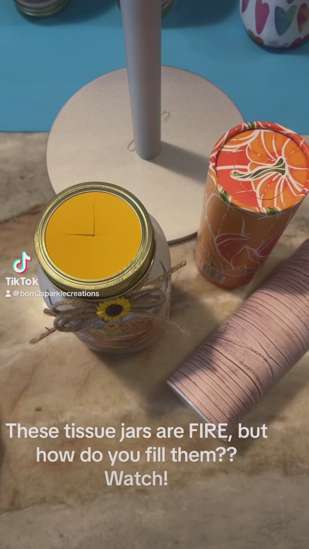 I use a color coordinated foam that is placed inside of the canning band to allow tissue pop-ups. Each jar comes with a container of tissues. I recommend Kleenex Perfect Fit tissues (or generic from Amazon, Walmart, Dollar Store, etc) as they come in a round, vertical container and are easier to use in the jar as there is no folding needed. simply pop the bottom off and drop the tissues into your Mason jar.
